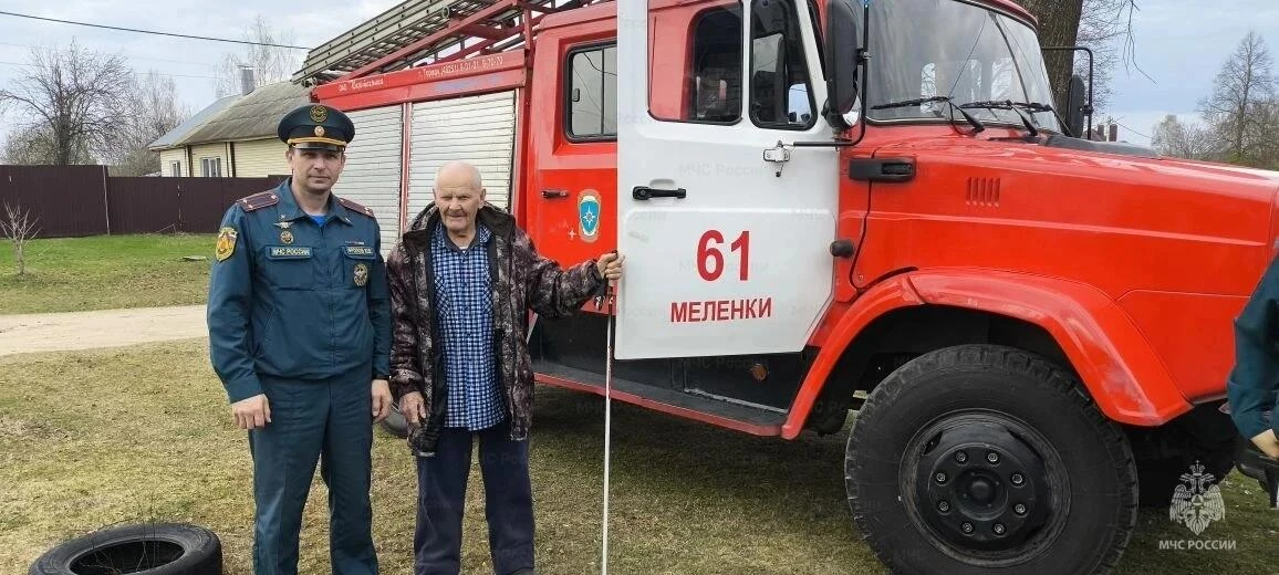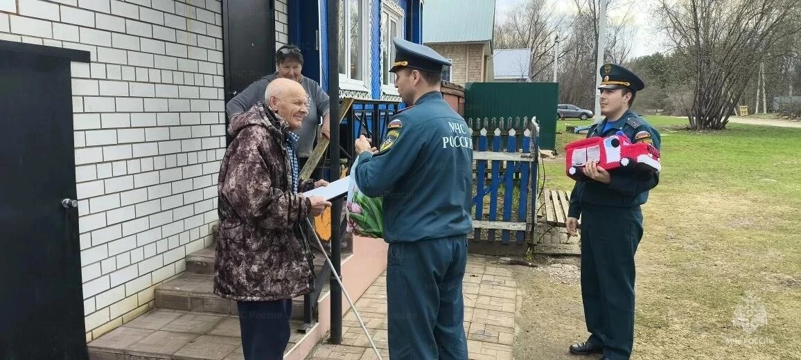Ещё одному ветерану - Владимиру Конышеву, труженику тыла Великой Отечественной войны, сотрудники МЧС России передали подарки-сувениры по пожарной тематике, сделанные руками школьников о. Муром.