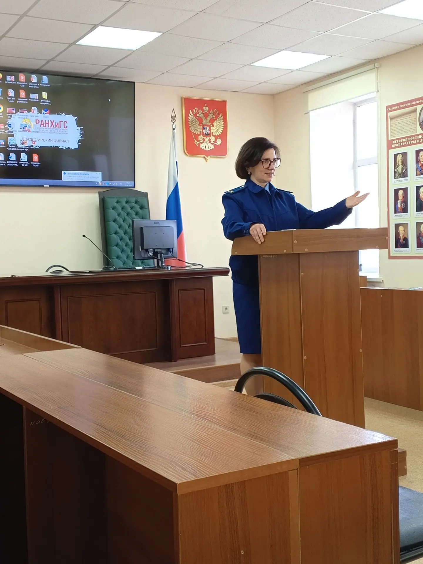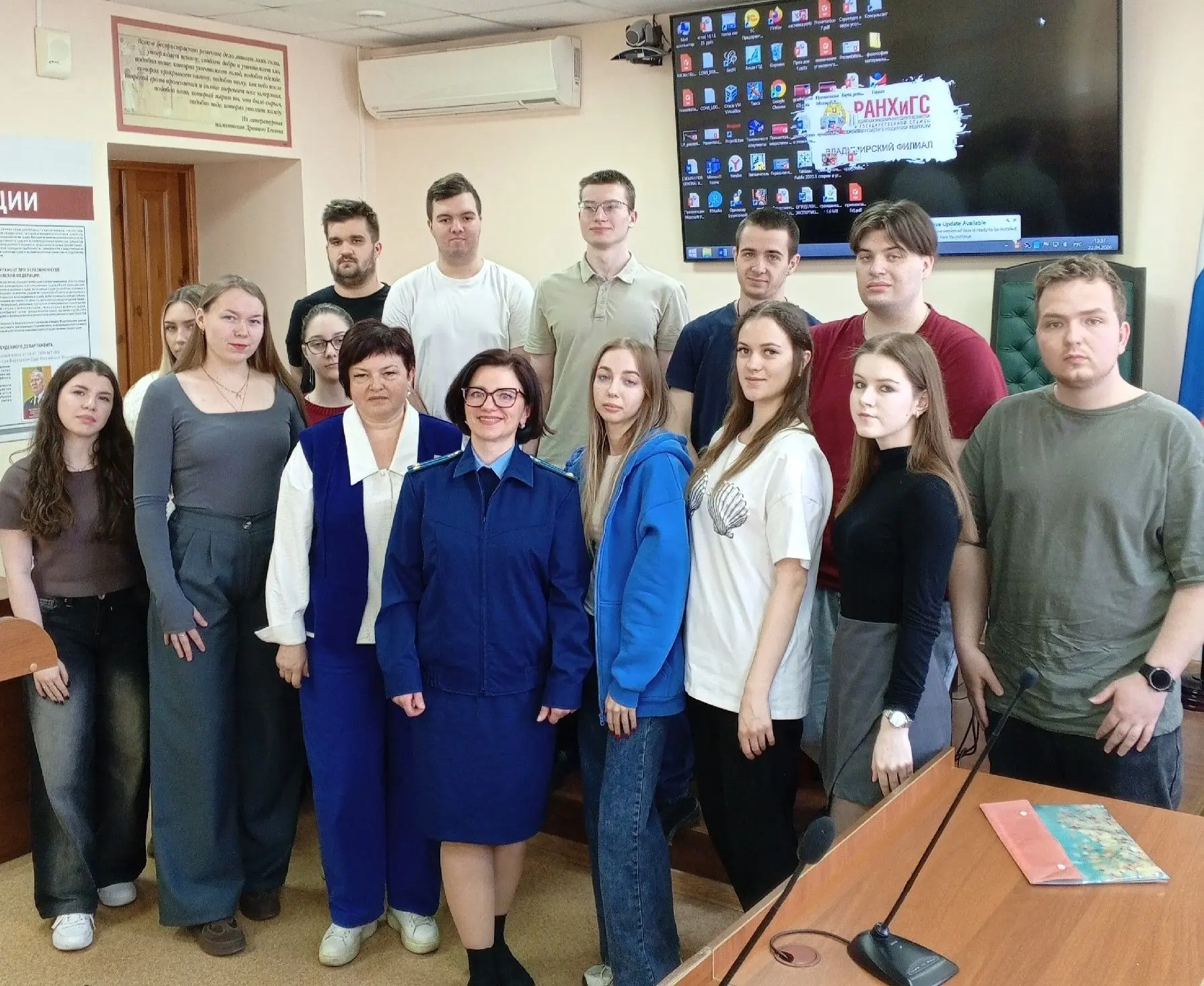Старший прокурор отделом кадров прокуратуры области Анна Гоголева в рамках проведения мероприятий по правовому просвещению организовала встречу со студентами четвертого курса юридического факультета Владимирского филиала Российской академии народного хозяйства и государственной службы при Президенте Российской Федерации.