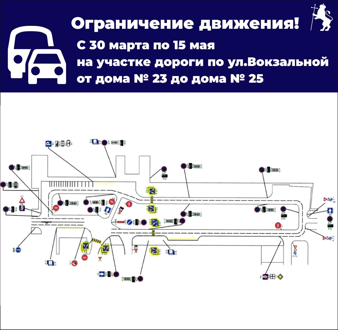 В связи с производством работ по капитальному ремонту Вокзальной площади, участок автомобильной дороги от дома 23 до дома 25 по улице Вокзальной будет перекрыт с 30 марта 2026 года по 15 мая 2026 года.