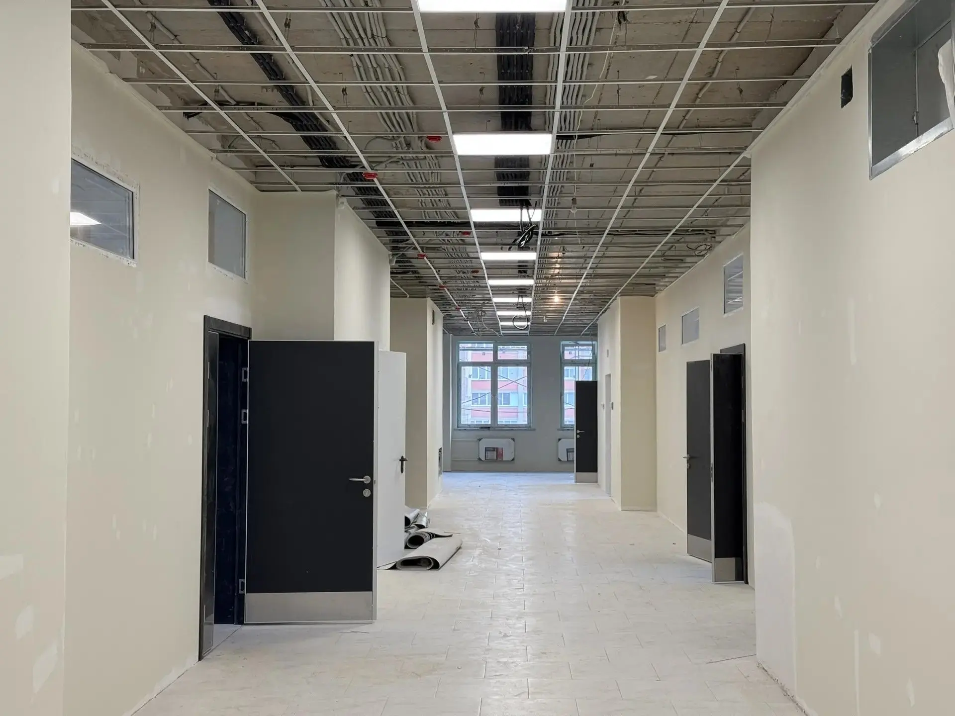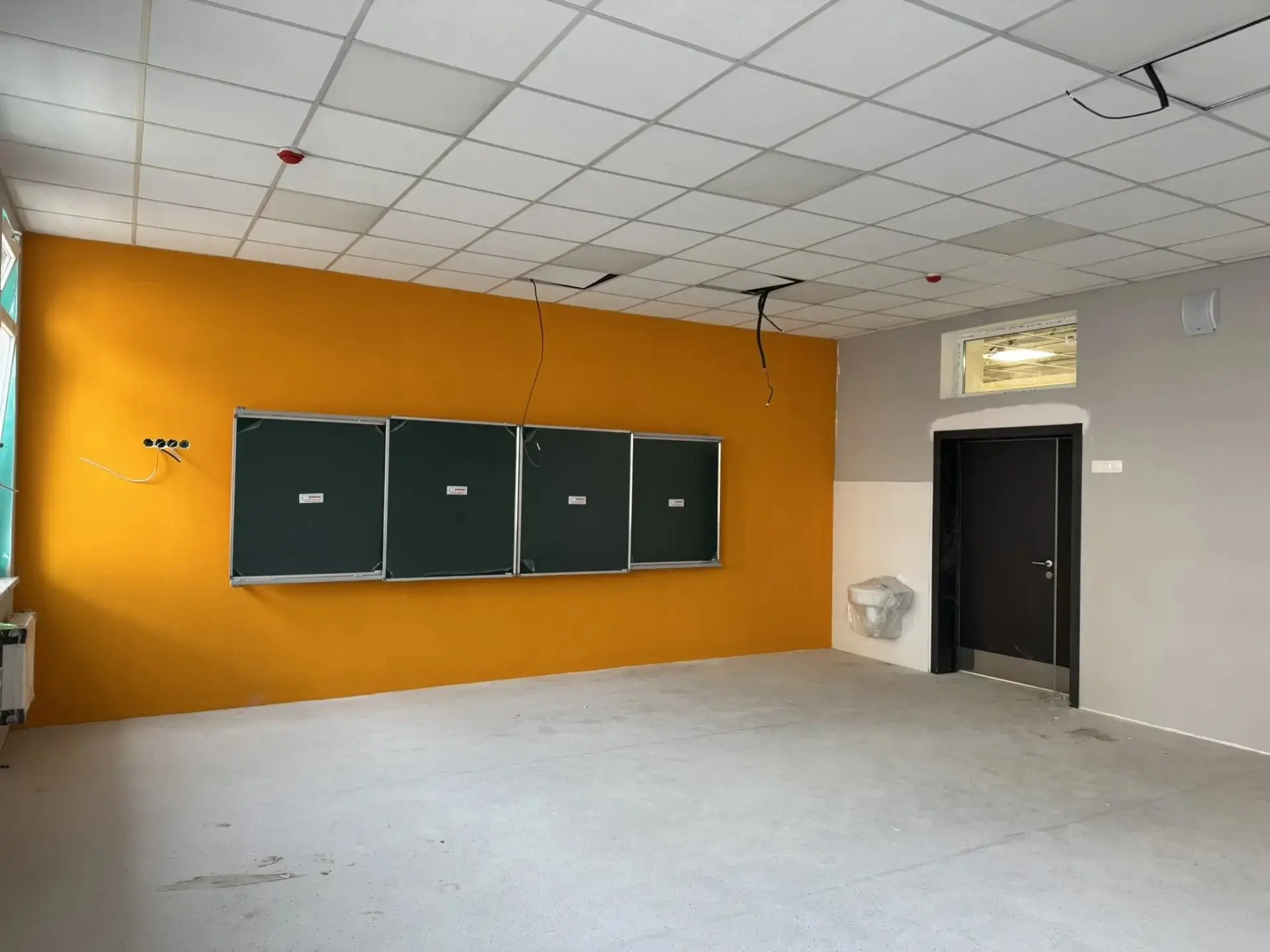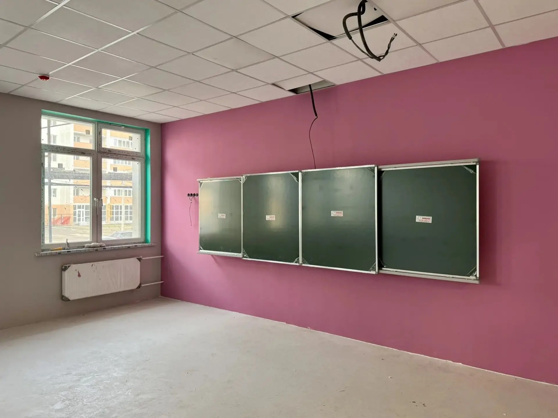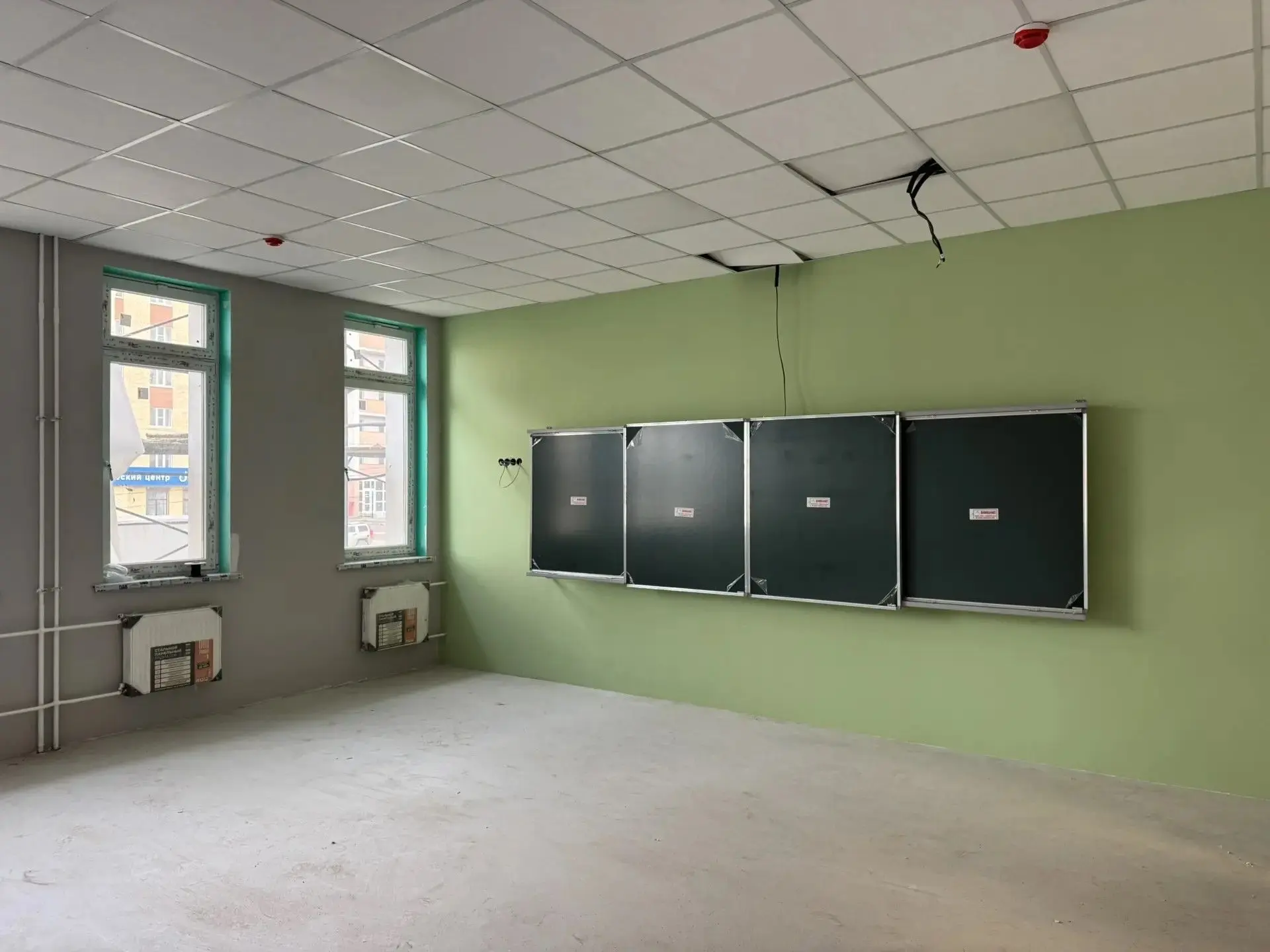 Продолжаются: укладка плитки в санузлах и коридорах; сборка потолков в классах и коридорах; укладка линолеума в классах; покраска стен в классах.