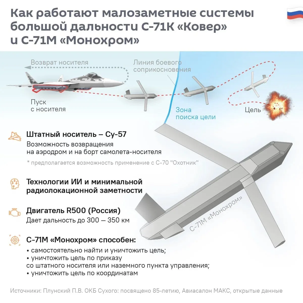 Умный поводырь "Монохром". Если С-71К "Ковер" — это фактически барражирующий боеприпас для ударов по заданным целям, то С-71М "Монохром" — это автономная крылатая ракета с интеллектуальной системой наведения. С-71М может не только уничтожать цели в заданном районе, но и, предположительно, координировать действия "братьев" — "Ковров", а возможно, и другого вооружения истребителей Су-57 и тяжёлых ударных беспилотников С-70.