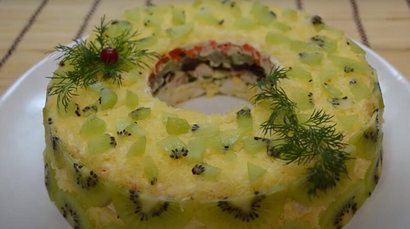 4. Начинать укладывать слои нужно с яиц, за ними идут зеленый лук, курица, чернослив, киви и потом морковь. Завершает конструкцию сыр, натертый на мелкой терке.