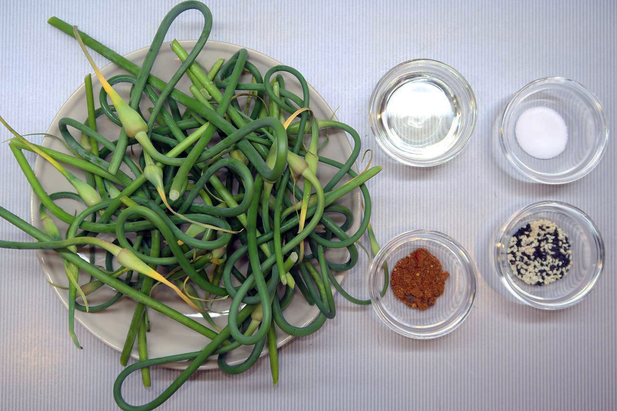 Чтобы начать, чесночные стрелки тщательно промываются под проточной водой, после чего следует дать им немного обсохнуть. Верхнюю часть с бутоном и нижнюю, более светлую часть стрелок, убирают — они не нужны для готовки. Далее, нарезать стрелки на сегменты длиной 3-4 см.