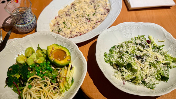 Для начала рекомендуется попробовать карпаччо из говядины с соусом тоннато. Блюдо сбалансировано так, что ни один из компонентов не затмевает другой — соус подчеркивает вкус мяса, а пармезан только добавляет глубины. Затем можно заказать салат с индейкой и яблоком и нежный зеленый салат с авокадо. Главным блюдом стало стриплойн с перечным соусом и картофелем фри. Прожарка и качество мяса тут на высоте, а соус, хоть и плотный, великолепно подходит для картошки фри.