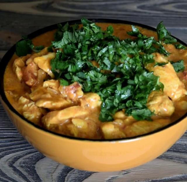 Когда курица замариновалась, перейдите к её обжариванию. На разогретой сковороде с 1 ч. ложкой растительного масла подрумяньте нарезанный лук вместе с остальными специями в течение нескольких минут. Затем добавьте очищенный и нарезанный томат, а также томатную пасту и тушите ещё пару минут на среднем огне.