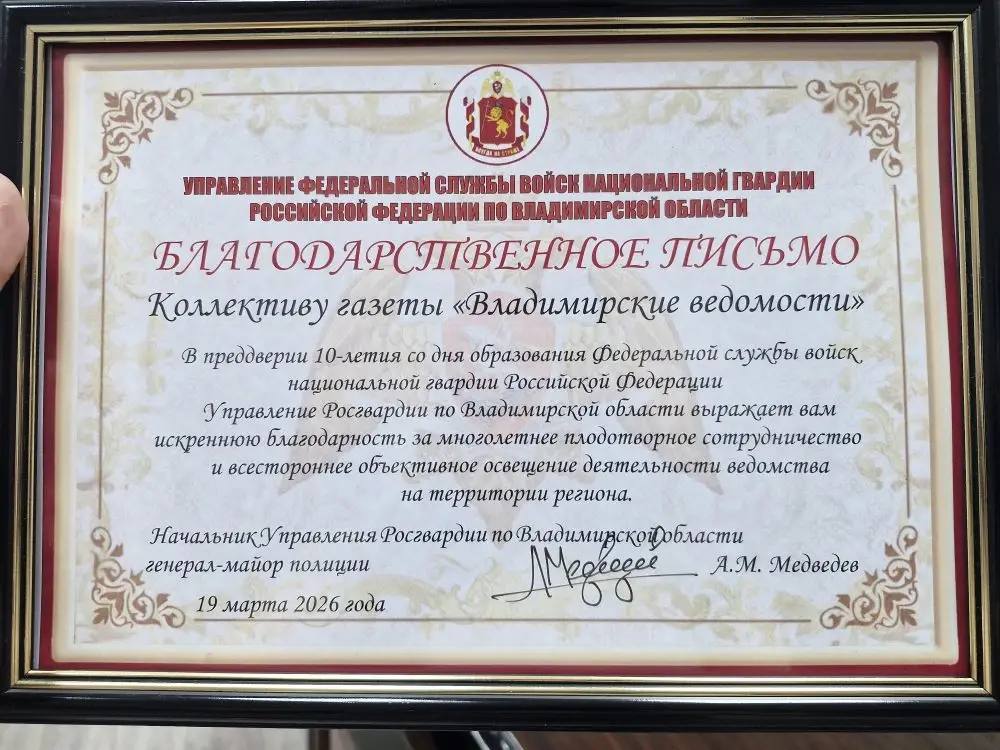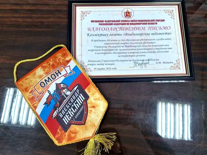 Коллектив «Владимирских ведомостей» получил благодарственное письмо от Управления Федеральной службы войск национальной гвардии Российской Федерации по Владимирской области.