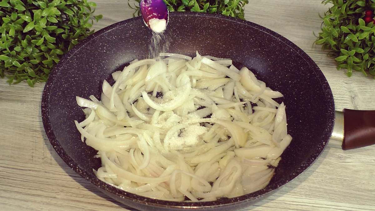 В процессе обжаривания лука добавить одну чайную ложку сахара и полчайной ложки соли. Лук нужно обжаривать до появления легкой румяности.