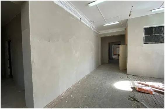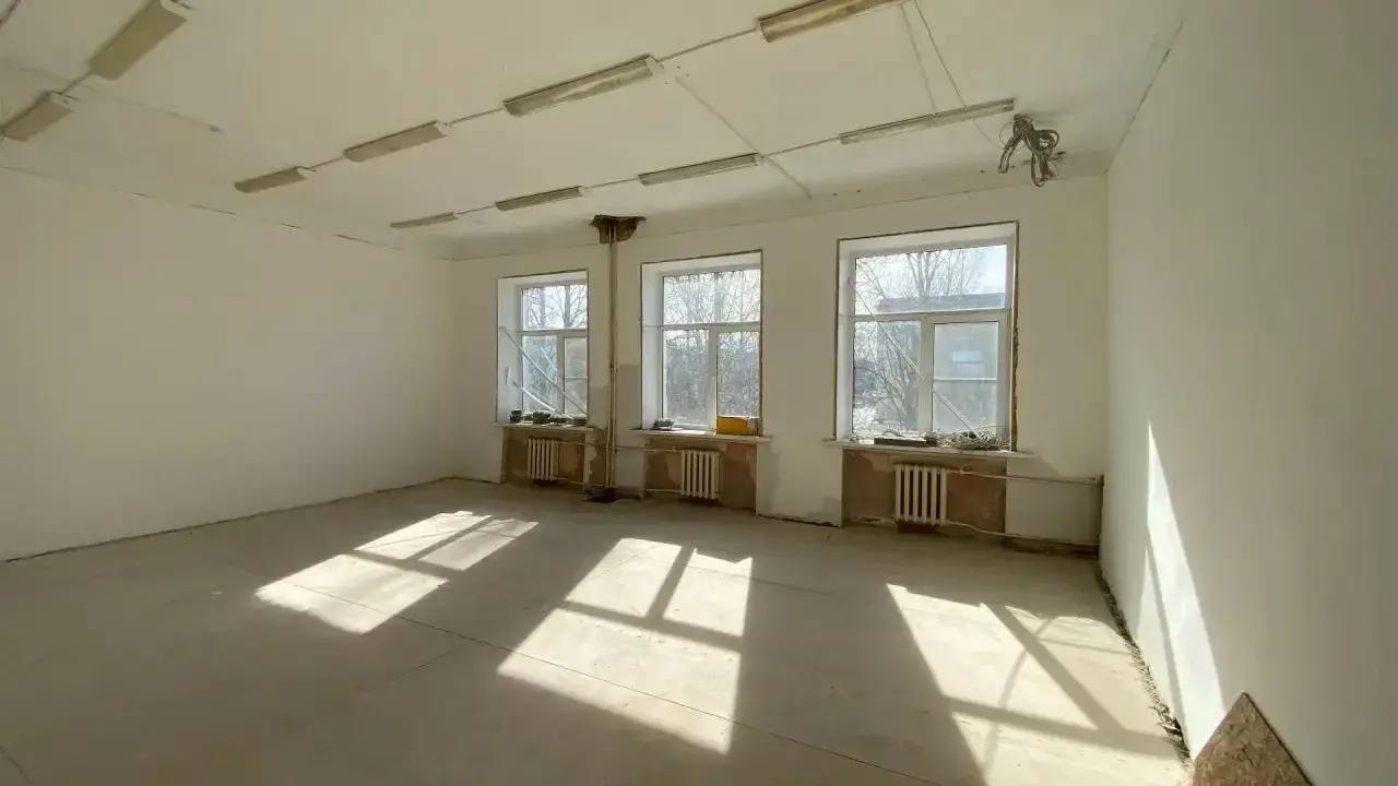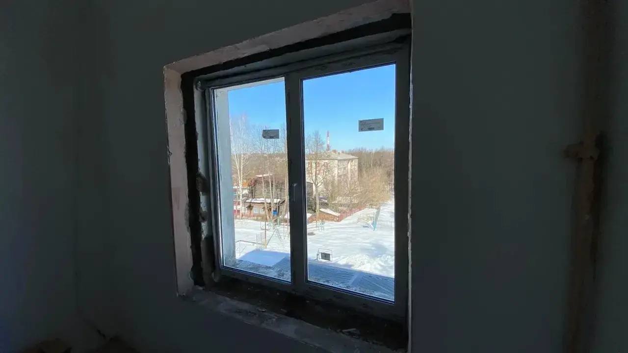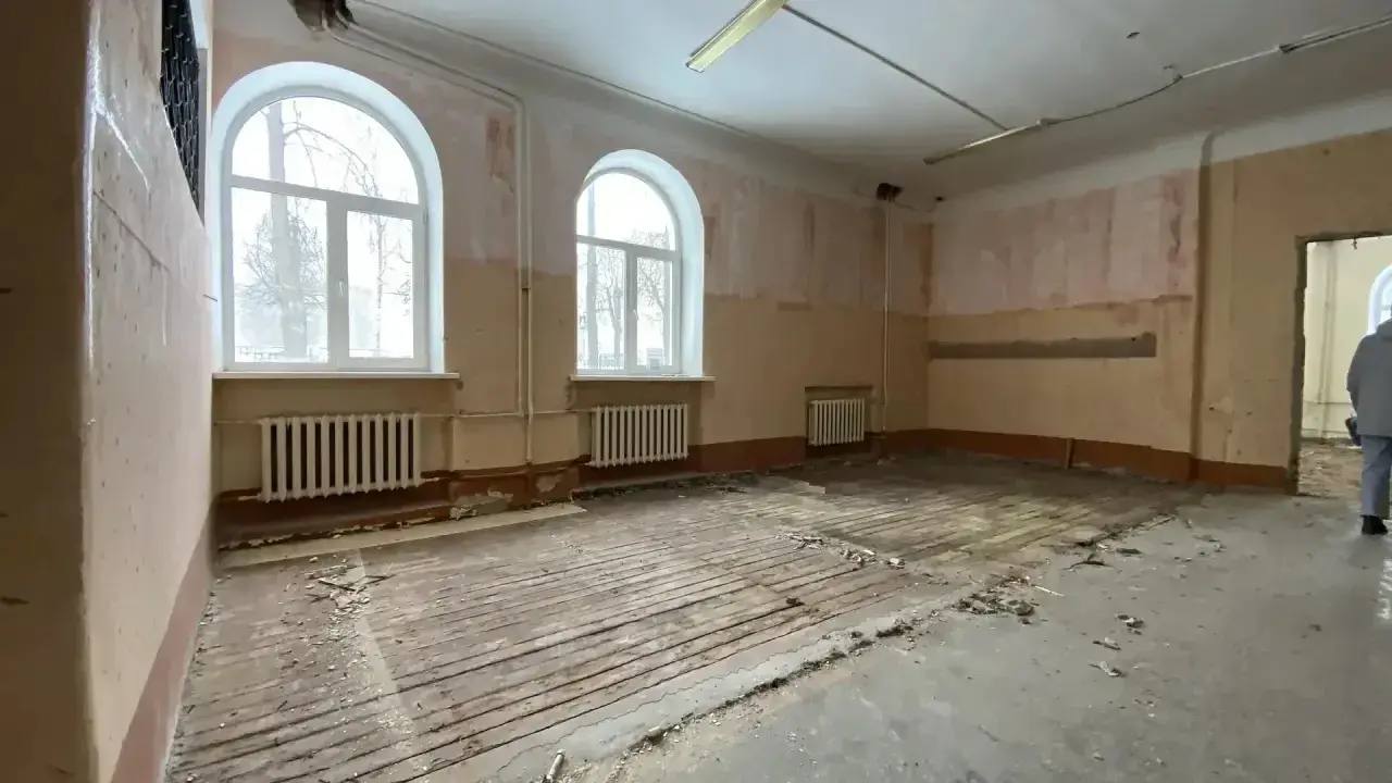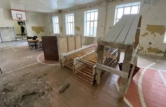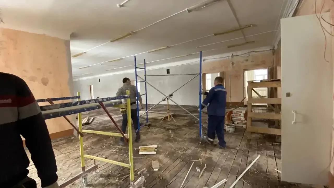 На втором и третьем этажах в классах, коридорах и на лестничных клетках выполнены штукатурные и шпаклевочные работы, стены и потолки лестниц подготовлены под отделку. Идут работы по замене полов, монтажу электропроводки, а также монтажу трубопроводов водоснабжения и канализации.