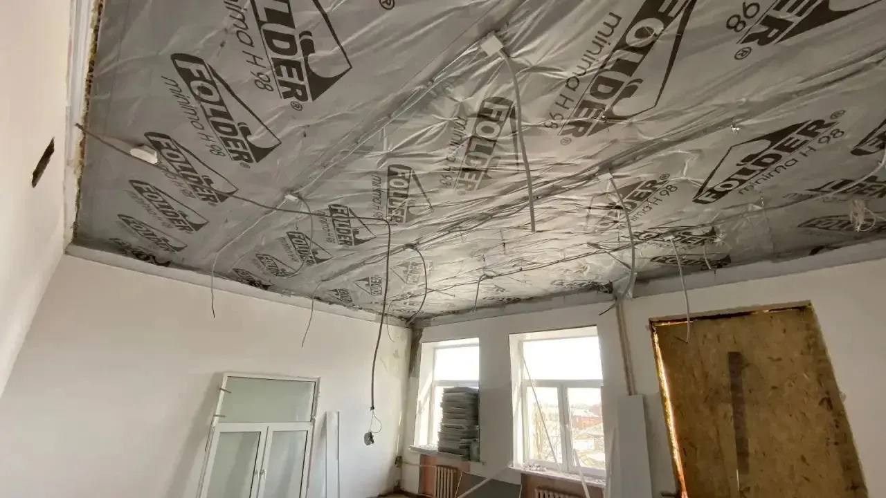 В школе №7 имени Н.К. Крупской в Кольчугино идет ремонт потолков и облицовка вентшахтах