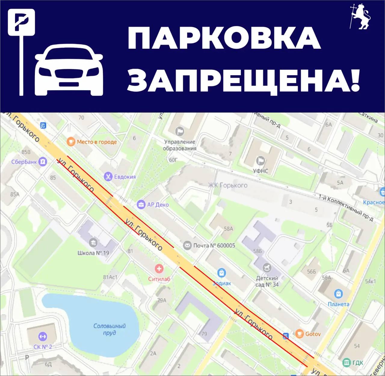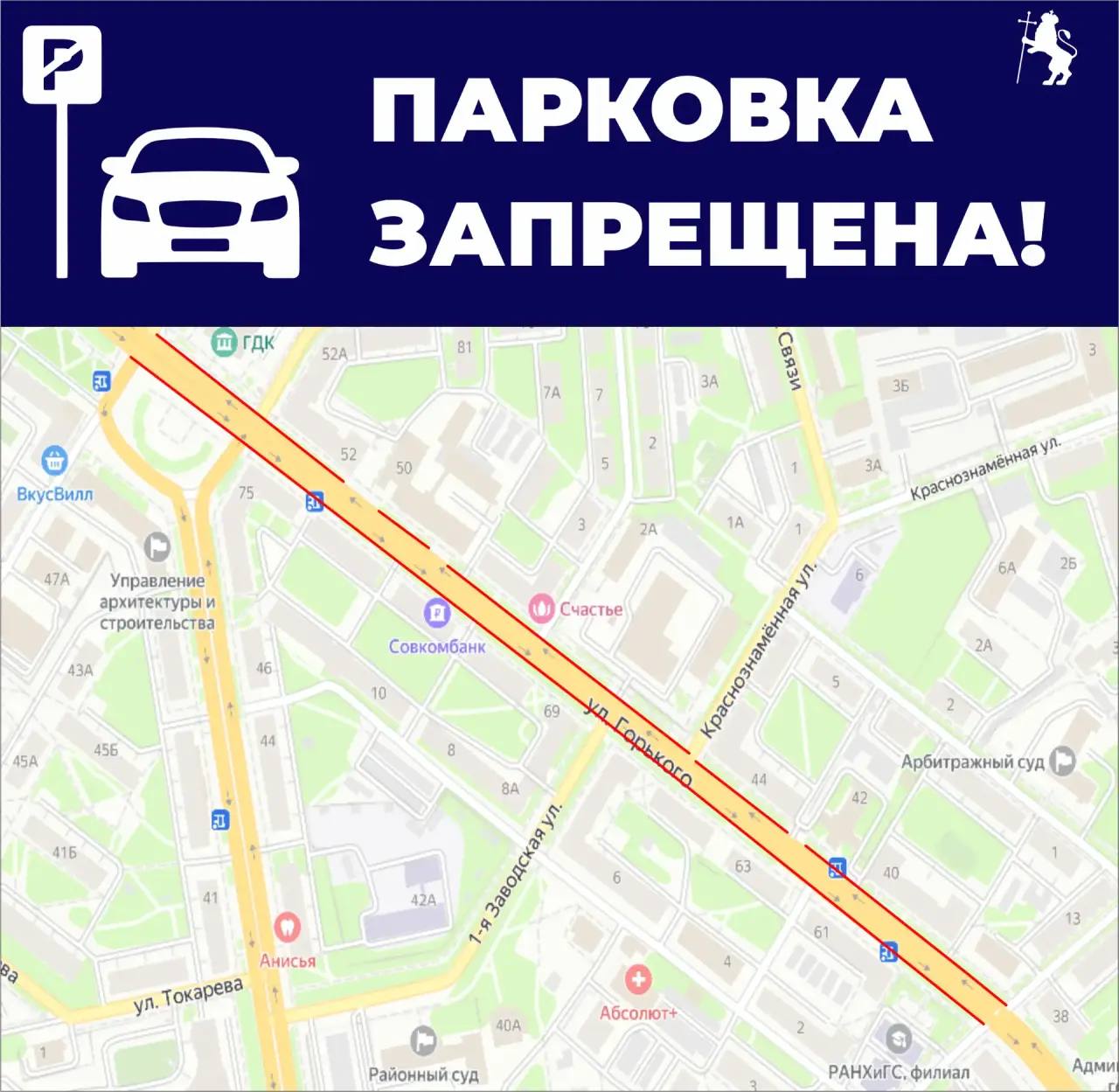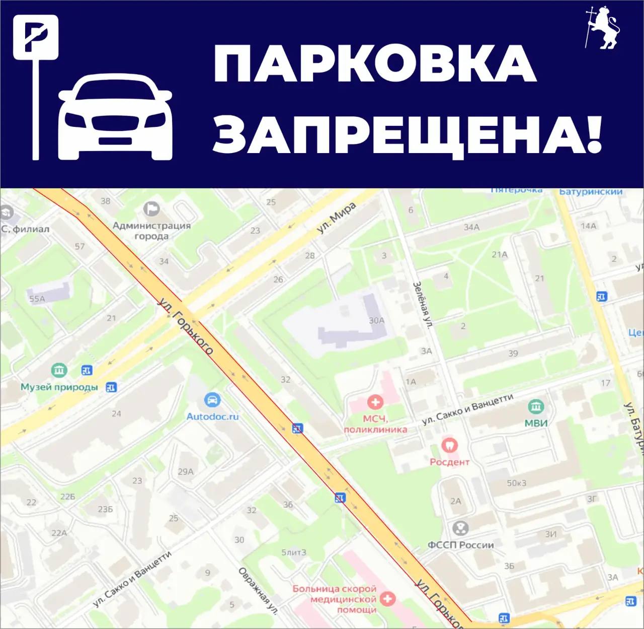 Обращаем ваше внимание, что в данный момент проводится корректировка организации дорожного движения на улице Горького. В карточках вы найдете информацию о новых ограничениях парковки.