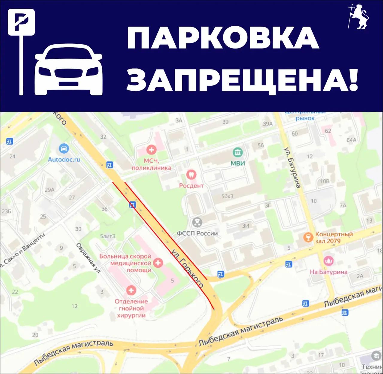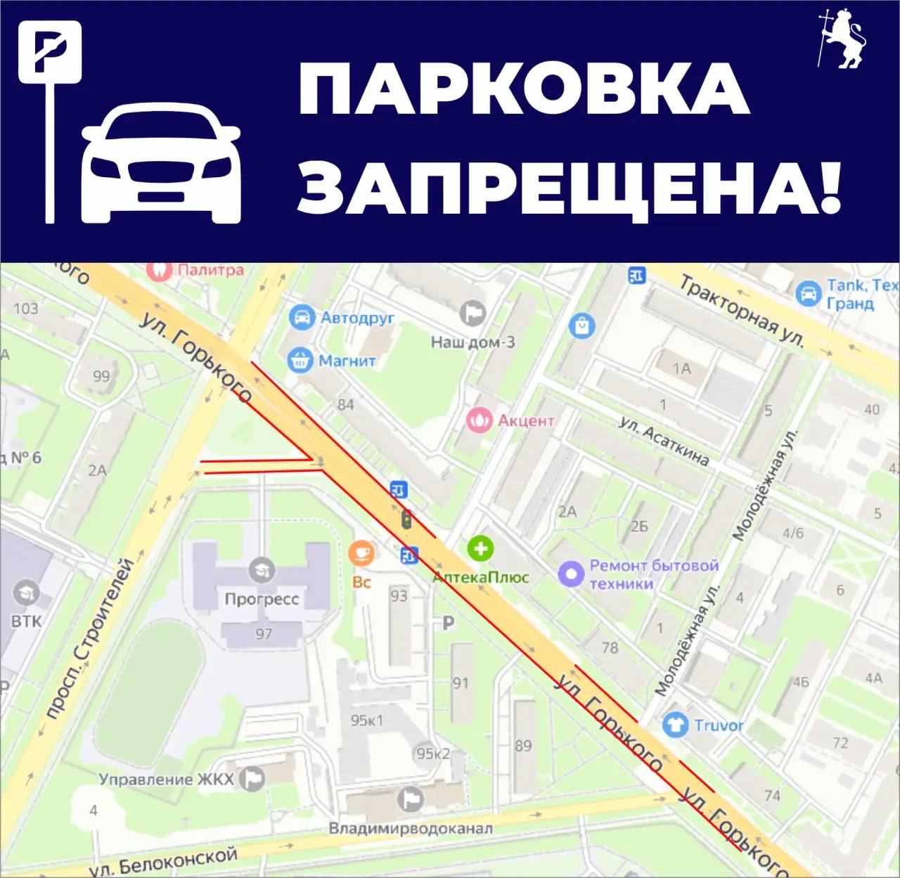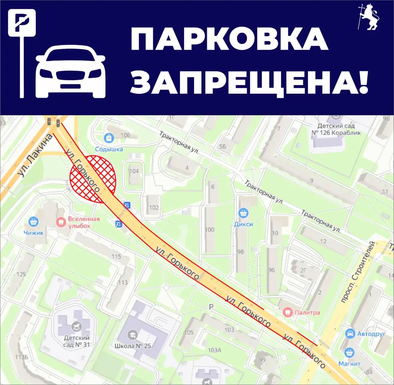 Обращаем ваше внимание, что в данный момент проводится корректировка организации дорожного движения на улице Горького. В карточках вы найдете информацию о новых ограничениях парковки.