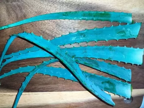 - Ручной способ: Листья моются, обсушиваются и очищаются от шипов. Затем срезается верхний слой кожуры, и с помощью ложечки (желательно фарфоровой или пластиковой) выскабливается желеобразная мякоть. Далее её можно процедить через марлю и слегка отжать для достижения чистого сока.