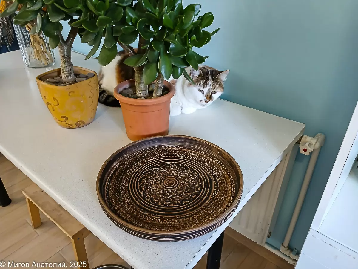 На прощание Эдем презентовал авторскую работу — керамическое блюдо, которое художник рекомендовал использовать для сервировки мяса. Однако на столе в тот день оказались только фрукты, и блюдо стало отличным украшением стола.