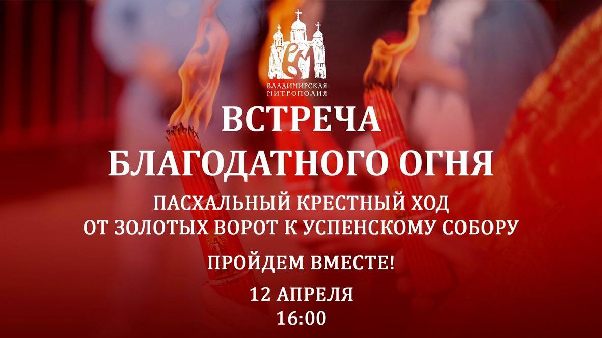 12 апреля в 16:00 у Золотых ворот во Владимире встретят Благодатный огонь. После этого начнется Пасхальный крестный ход к Свято-Успенскому собору.