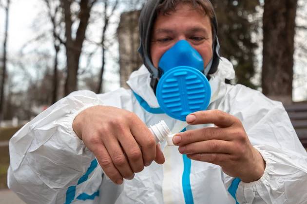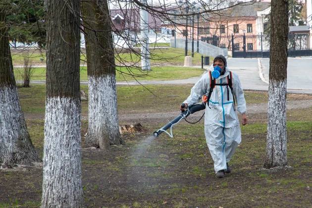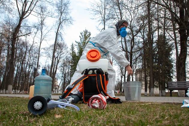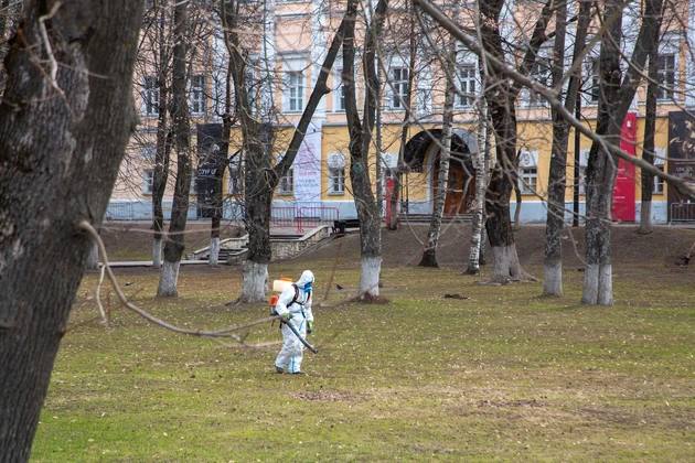 И вот утром 15 апреля в опустевшем парке «Липки», входы в которые были действительно загорожены. Среди черных стволов лип мы увидели двух сотрудников специализированной организации в белых защитных комбинезонах и с респираторами. Они последовательно обходили участки парка и из опрыскивателей выпускали на пробивающуюся траву «заряды» водного раствора химиката с неприятным запахом.