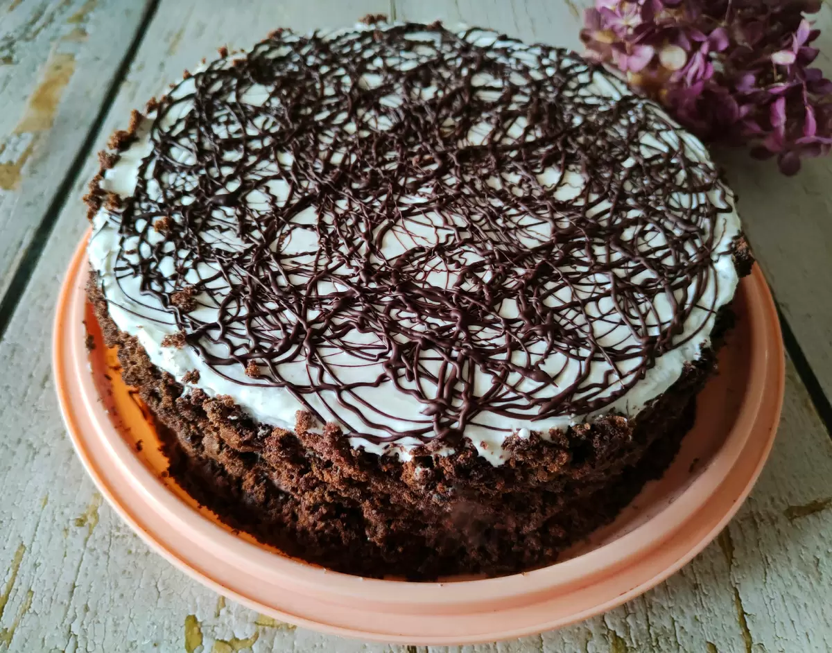Торт настаивать в холодильнике хотя бы несколько часов, а перед подачей украсить шоколадной стружкой и обмазать бока отложенным кремом. Такой торт станет звездой любого застолья!