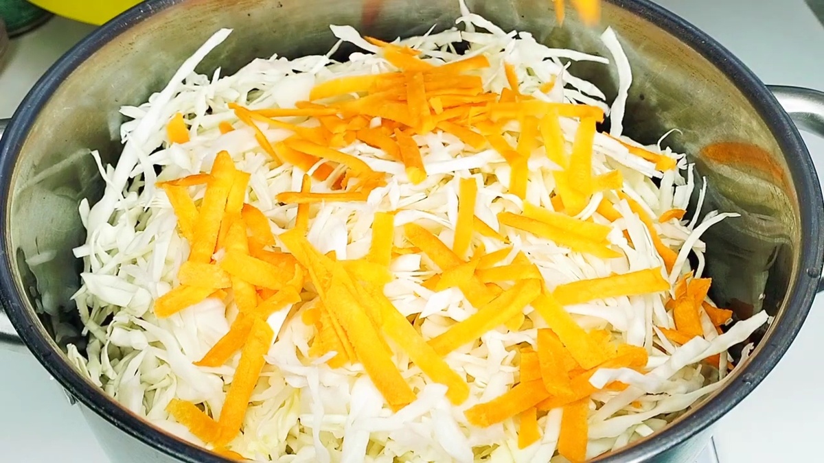 Для получения гармоничного вкуса к капусте добавляют одну морковь среднего размера. Морковь натирается на крупной тёрке, что придаёт дополнительный цвет и сладость.