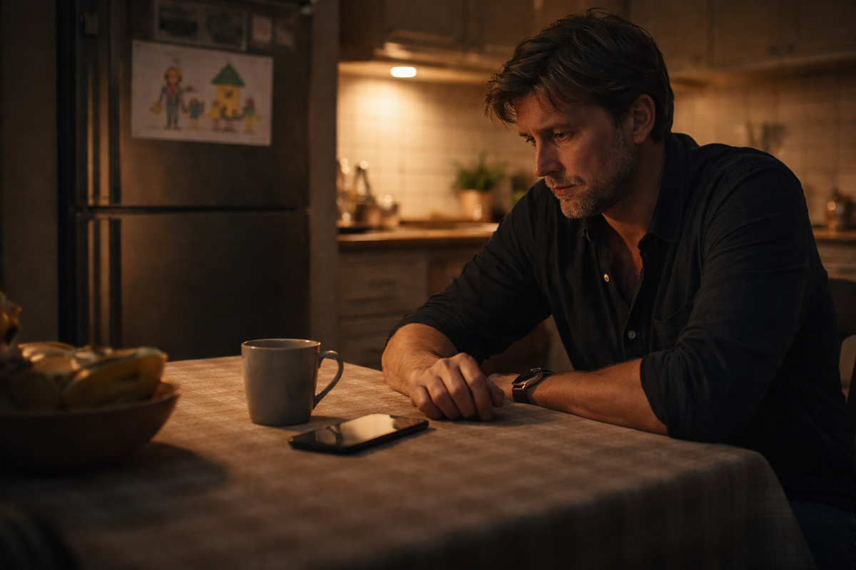 Сергей тихо произнёс эти слова, словно опасаясь их услышать: «Раз — и нет семьи…» На кухне витал запах холодного кофе, а за окном постепенно наступала ночь, отражая пустоту его квартиры — слишком большой для одного.
