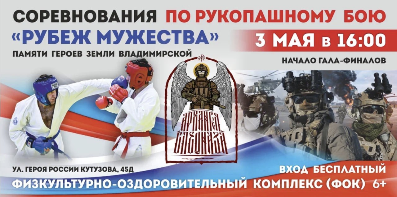 Межрегиональные соревнования по рукопашному бою памяти погибших в ходе специальной военной операции воинов Земли Владимирской и Воинов команды "Архангел Спецназа" состоятся с 2 по 3 мая 2026 года.