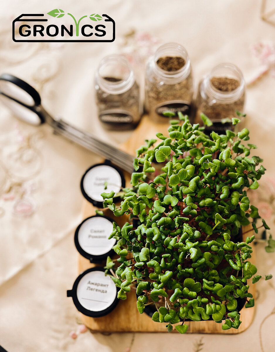 - Семена: Для микрозелени подойдут практически любые овощные и злаковые семена. Наиболее популярны амарант, соя, редис и гречка. Однако стоит избегать пасленовых культур, таких как баклажаны и помидоры, поскольку они могут содержать токсины. Быть внимательным стоит и с фасолью — ее использование требует дополнительных исследований.